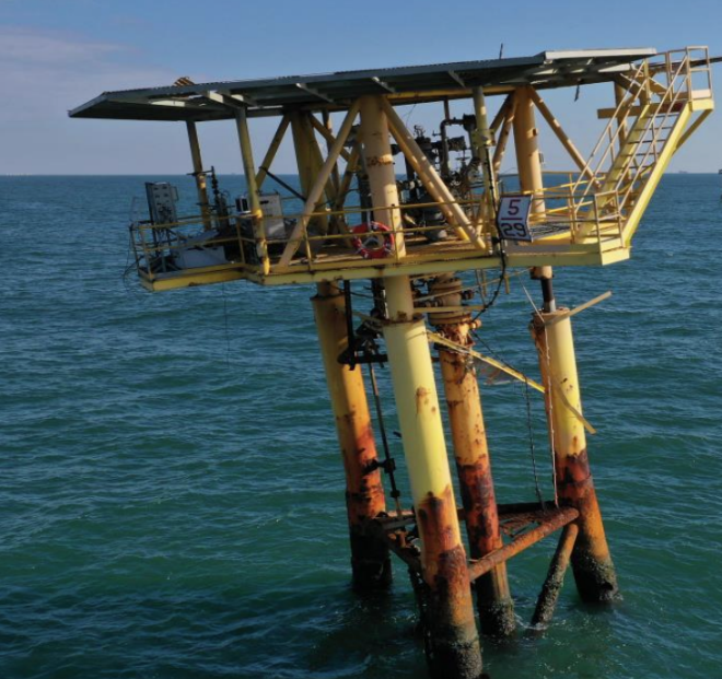 In preparation for Make-Safe and Well Abandonment, an initial aerial inspection was conducted in May 2025, revealing extensive damage: the boat landing was missing, heliport skirting had been torn away, the wellhead access deck was no longer intact, and the main deck support column had detached from the stabbing guide.